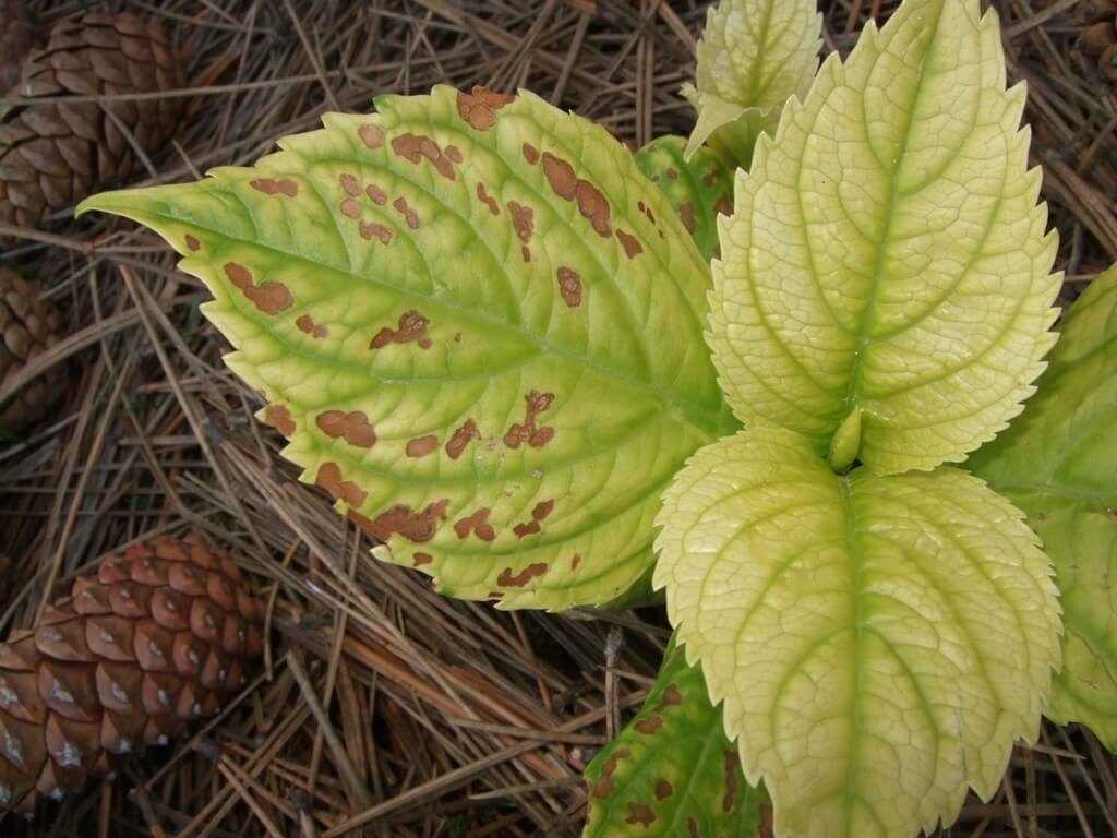 Реже гортензия болеет ложной мучнистой росой. Она поражает листья и стебли гортензий. Ее первые признаки – появление на листьях маслянистых, позднее желтеющих пятен, постепенно темнеющих и увеличивающихся в размерах. Снизу листьев появляется желтоватый налет, такой же налет может быть и на молодых стеблях. Развитию болезни способствует высокая влажность воздуха и температура 18-20 °С.