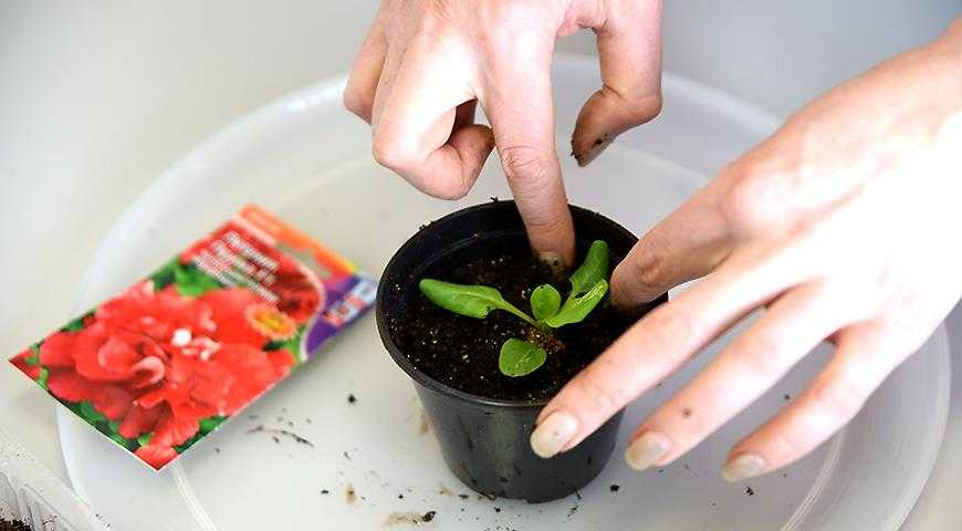 - Углубите сеянец в новой емкости в предварительно подготовленное углубление.