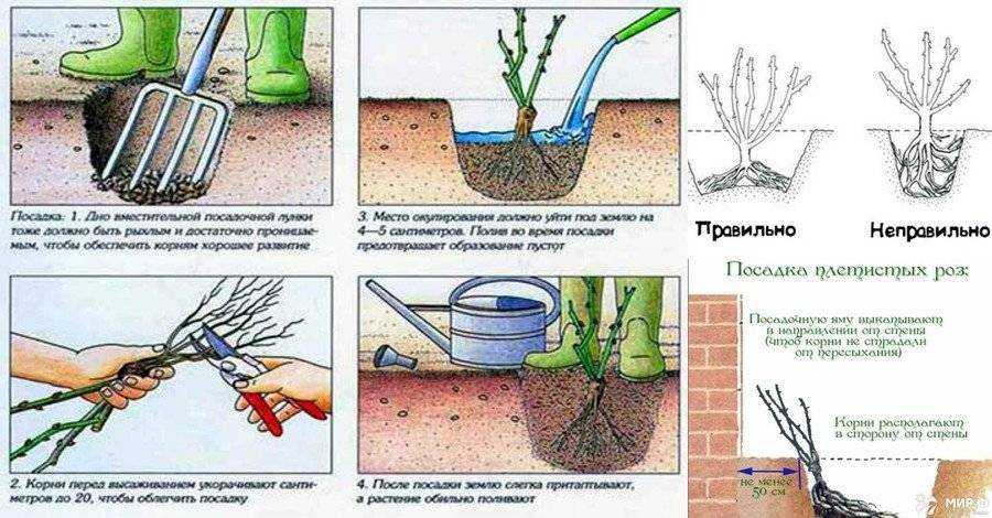 Корни саженца требуется обработать перед посадкой, замочить их в чистой воде или в растворе стимулятора роста, удалить слабые и укоротить чрезмерно длинные побеги. Саженцы нужно высаживать в лунки глубиной 50 см, ширина зависит от объёма корневой системы.