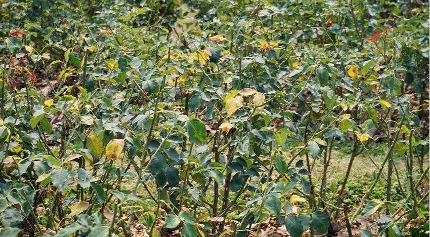 Плотная посадка роз в розарии без профилактических обработок — благоприятное условие для развития черной пятнистости