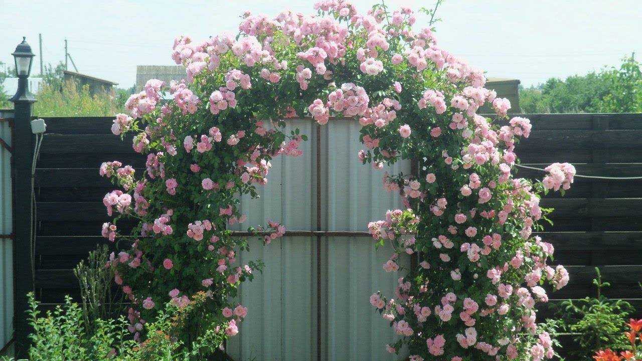 Плетистая роза нежно-розового цвета гармонично смотрится в виде арки