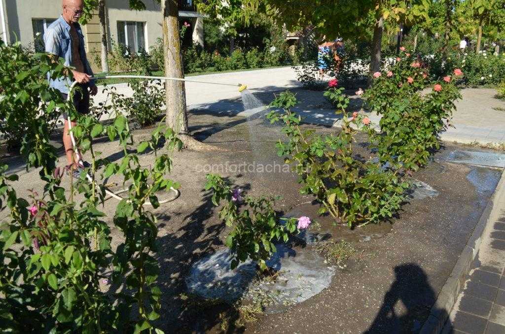 Уличные розы любят полив. Особенно часто их следует поливать после высадки в открытый грунт. Поливать растение лучше по утрам, и воду следует лить под корень. При этом почва должна промокнуть всего на несколько сантиметров в глубину. В среднем, на один взрослый куст уходит ведро воды. Осенью полив постепенно сводится к минимуму.