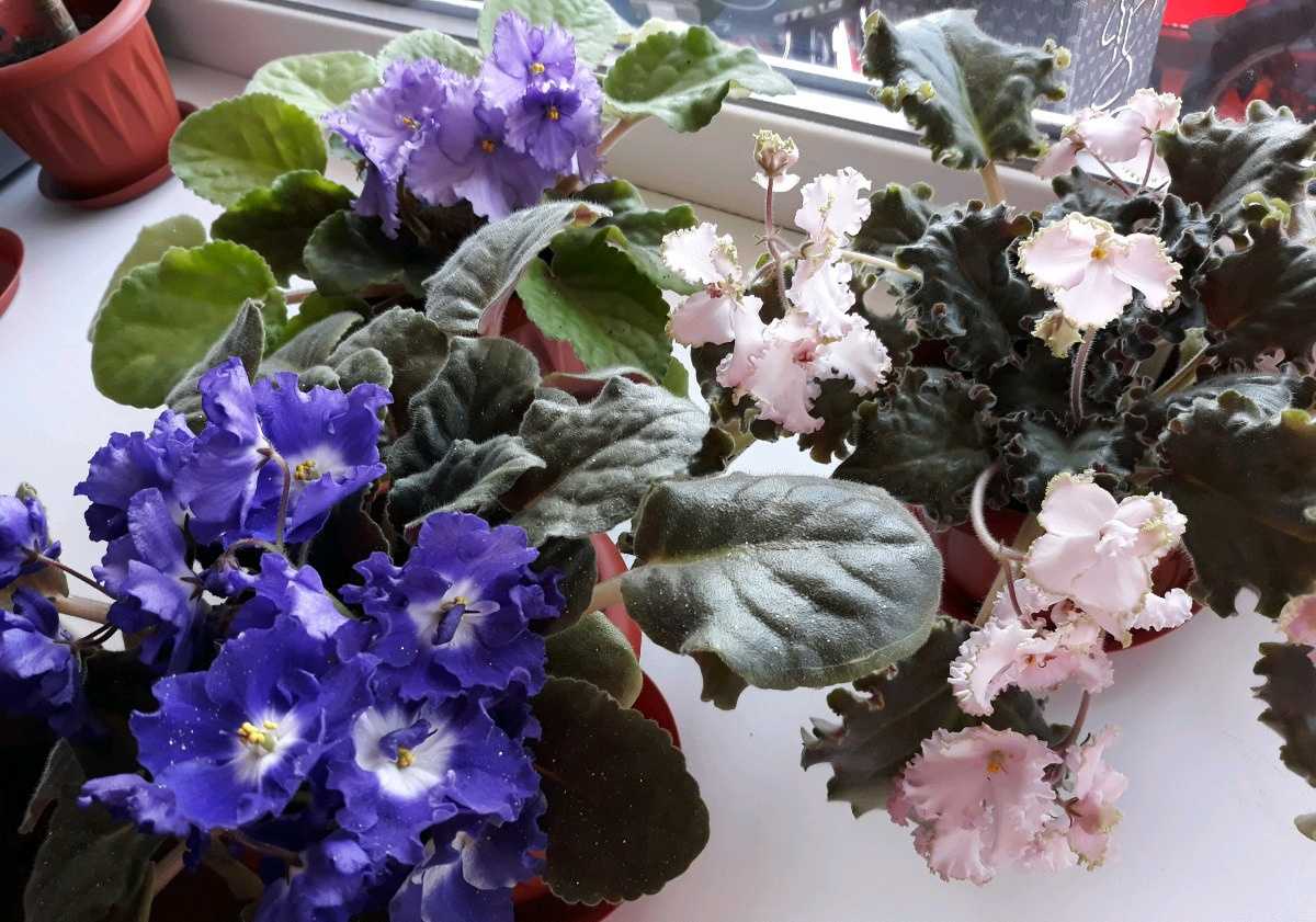 А эти фиалки комнатные с большим количеством зелени на цветах: