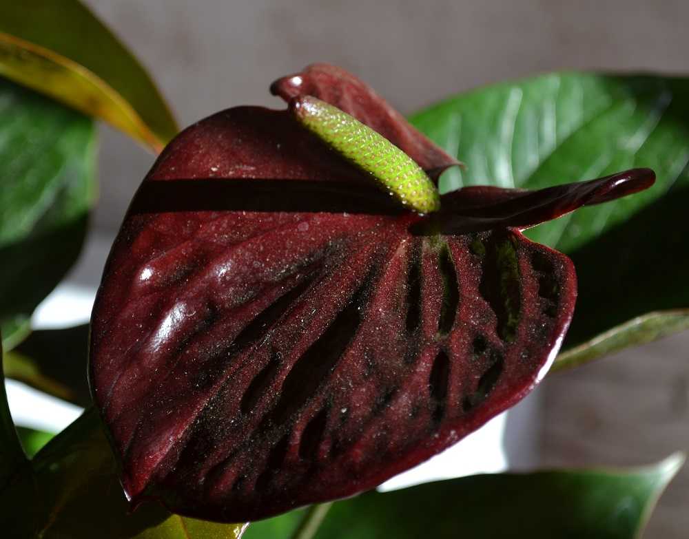 Черные или красные покрывала на початках антуриума прекрасно гармонируют с темными листьями, которые отливают глянцевым блеском и разрисованы более светлыми прожилками.