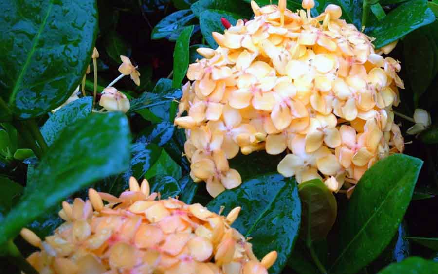 Во время цветения иксора выпускает соцветия в виде зонтиков, представляющих большое количество цветочков имеющих красный, розовый, желтый, белый и апельсиновый оттенок. Размер у соцветия около 20 см. Цветочки у этого растения состоит из четырех лепестков с продолговатой немного заостренной к окончанию формой. Обильным цветением у иксор можно насладиться во время дождевого сезона.