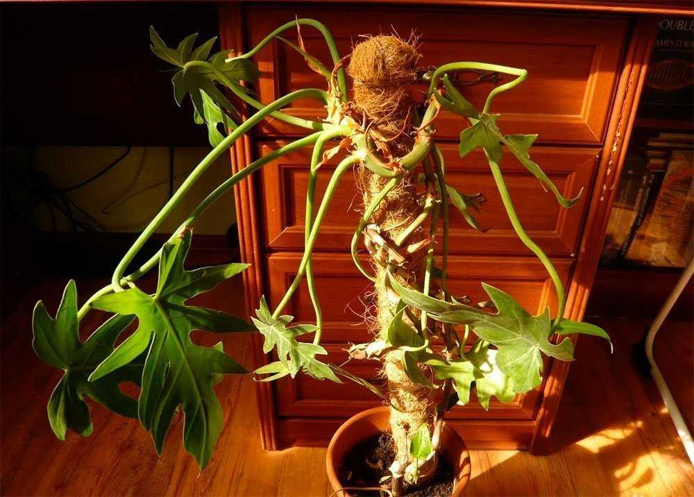 Если выбор пал в пользу лиан, им следует обеспечить удобную опору. Такие филодендроны в процессе роста цепляются воздушными корнями. Поэтому выбор следует остановить на опорах, обвитых подходящим материалом, например, мхом или кокосовым волокном. Прекрасно смотрятся и разветвлённые подставки. При умелом прищипывании побегов филодендрон очень быстро их оплетает.
