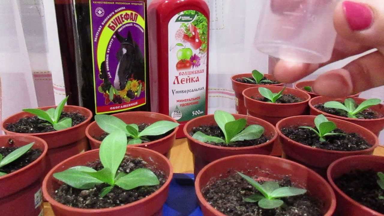 После пикировки рассада начинает активный рост. В это время ей нужно много азота для развития побегов и калия – для роста корневой системы. Поэтому раз в 2 недели до высадки в грунт подкармливайте сеянцы комплексным удобрением для цветов или рассады. Подойдет также универсальное удобрение или зола.