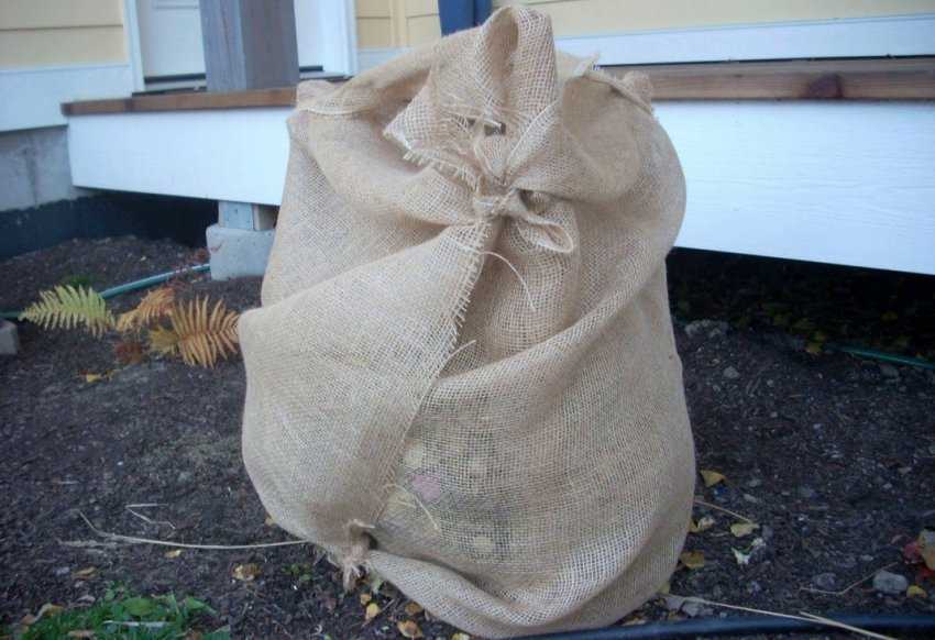 - Накройте ветки спанбондом или мешковиной, поверх следует выстелить хвойный лапник, сено или солому слоем не менее 10 см.