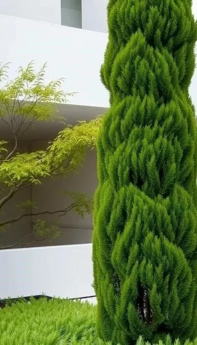 Лиственные породы также находят свое место, если их форма соответствует строгим критериям. Береза повислая (Betula pendula) благодаря светлому стволу и воздушной кроне привносит легкость и контраст, не нарушая общей лаконичности. Ее вертикальные стволы могут создавать ритмичные ряды. Клен японский (Acer palmatum) ценится за изящную форму и возможность придать саду сдержанный цветовой акцент. Его контролируемый рост и интересная листва идеальны для точечных посадок. Наконец, Дуб черешчатый (Quercus robur), с его монументальностью и долговечностью, может стать мощным, долгосрочным элементом, закрепляющим композицию и придающим ей основательность. В минимализме, как известно, «важна каждая деталь: от тщательно подобранных растений до лаконичных архитектурных элементов», и деревья здесь не исключение, они должны создавать «чистые линии и геометрические формы», помогая создать общую концепцию.