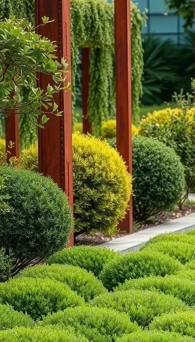 Интеграция с материалами: Сочетание кустарников с металлическими конструкциями и бетонными элементами подчеркивает стиль постиндустриализма. Использование контейнеров, решеток и других элементов позволяет создать интересные визуальные эффекты.