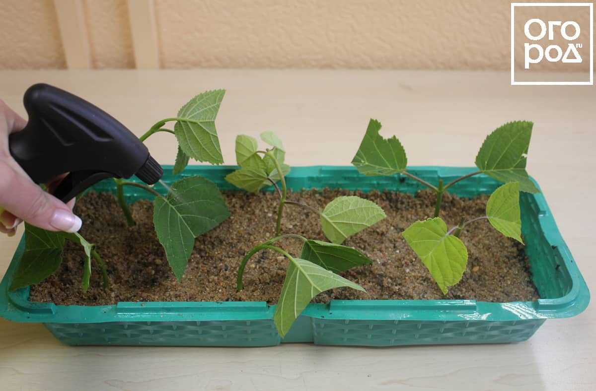 Черенки опрыскивают чистой водой при помощи пульверизатора.