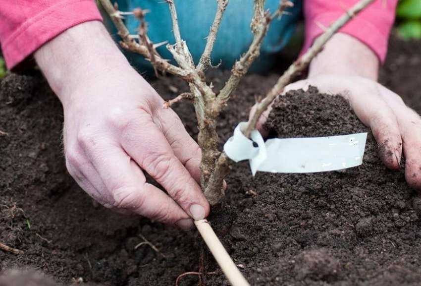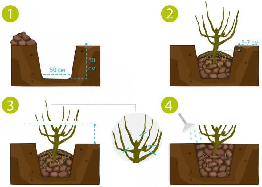 Для посадки выкапывают ямы глубиной 0,6 м и шириной 0,5 м. Оптимальное расстояние между кустами — 2 м. За неделю до высадки в лунки вносят плодородную смесь: